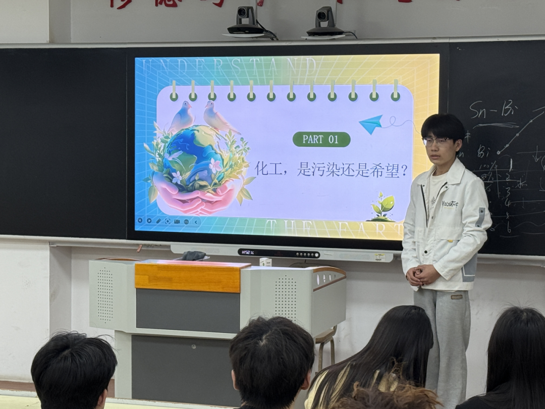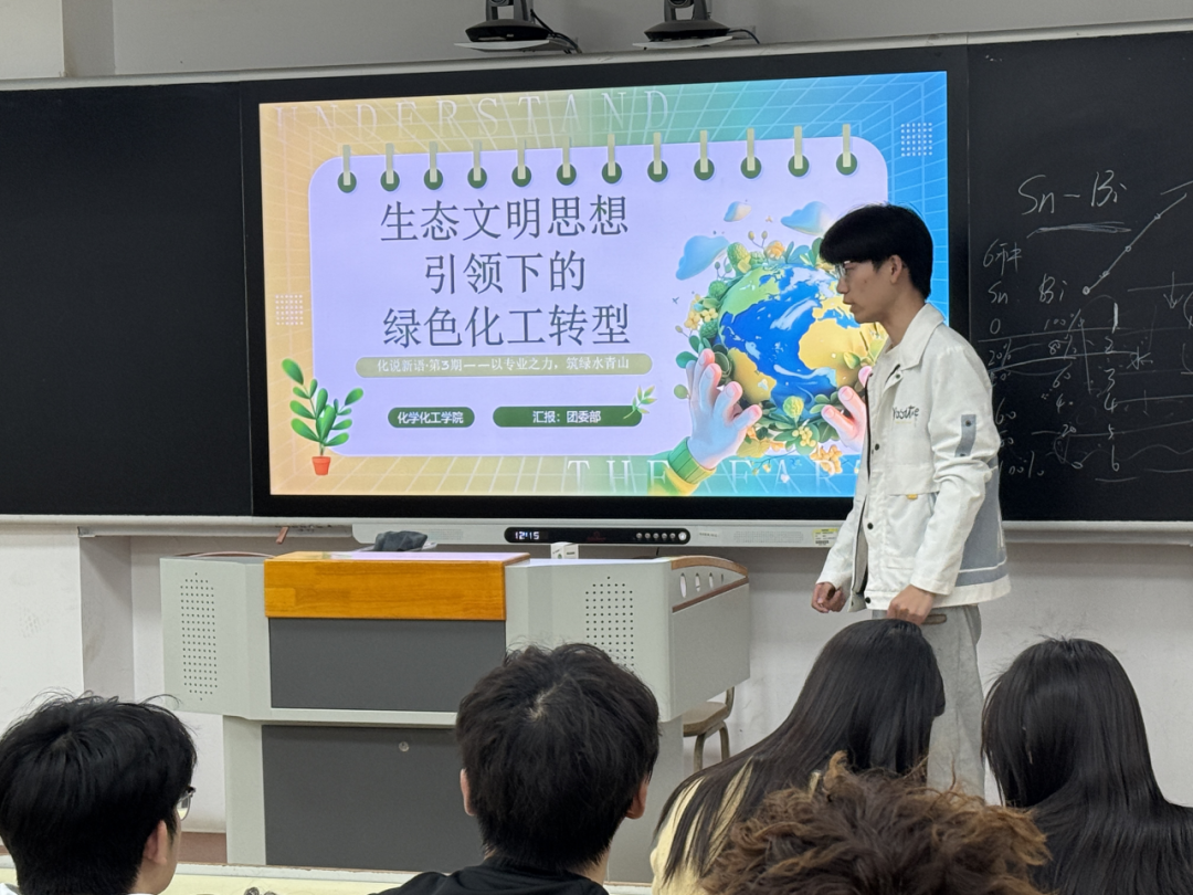 宣讲会上,赵兴航以“绿水青山就是金山银山”为核心,系统阐释习近平生态文明思想的深刻内涵,结合党的二十大“推动绿色发展,促进人与自然和谐共生”重要论述与2026年政府工作报告“重点行业提质降本降碳、零碳园区建设”等时政热点,立足滨州化工大市向“低碳强市”跨越的发展背景,点明绿色化工是行业高质量发展的必然方向。互动提问环节,于远航、巴文彤、张修滔三位同学踊跃发言,围绕绿色化工技术应用、专业学习与低碳实践结合等问题积极交流,现场氛围热烈。宣讲同时聚焦绿色化工、零碳工厂、CCUS碳捕集等前沿领域,以中国平煤神马集团为例,分享企业研发氧化亚氮分解催化剂、打破国外技术垄断、建设亚洲首个百万方级盐穴储氢示范工程的实践成果,展现化工企业低碳转型的硬核实力,并结合学院团委学雷锋志愿服务、社区环保宣讲等实践活动,引导同学们将化学知识融入生活,以实际行动践行生态文明思想,让绿色理念落地生根。