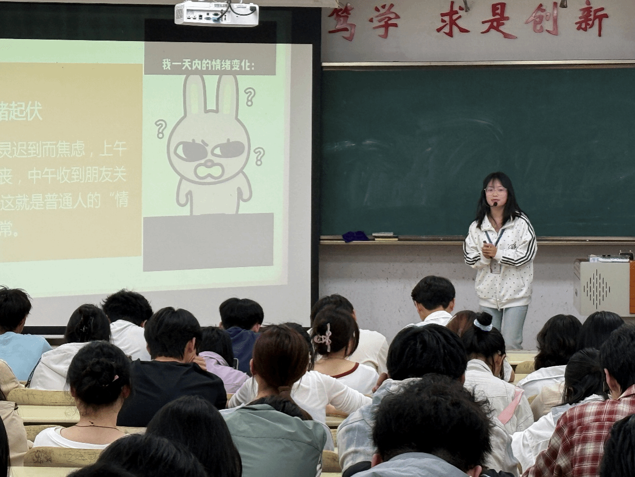 活动伊始,张海灵结合大学生的学习生活实际,深入浅出地讲解了情绪起伏的含义。她指出,情绪起伏并非负面现象,而是人体正常的心理反应,涵盖喜悦、焦虑、低落、平静等多种情绪的交替出现,帮助同学们打破“情绪稳定才是正常”的认知误区,引导大家正确看待情绪的波动。与此同时,她重点分享了“情绪调节三步法”。第一步是觉察情绪,引导同学们学会识别自身的情绪信号,准确感知情绪的种类和强度;第二步是接纳情绪,告诉同学们无论积极还是消极情绪,都是自身的一部分,坦然接纳才能更好地应对;第三步是疏导情绪,合理宣泄、转移注意力等实用方法,帮助同学们在面对负面情绪时避免情绪内耗。