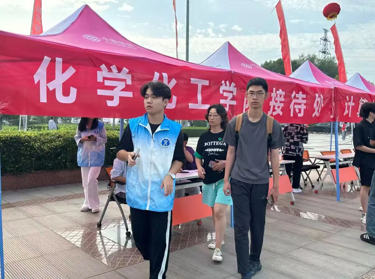迎新现场的“答疑角”前,始终围满了咨询的新生与家长,学院老师们和各位新生班主任成了这里的“主心骨”。老师们耐心接待每一位前来咨询的家长,从学院的课程体系、实践平台,到日常的教学管理、奖助政策,都用通俗的语言一一拆解,让家长们清晰了解孩子未来的学习与成长环境。新生班主任们更是主动向前,一边核对新生信息,一边热情地和家长交流孩子未来的班级管理规划,细致的解答让家长安心,也让新生对即将到来的班级生活充满期待。而志愿者们的“服务小技巧”更显用心:有人提前查好天气,给带伞的新生递纸巾擦汗;有人整理出“化工专业必知小贴士”,随手发给有疑问的萌新;还有人主动帮新生和家长拍“入学第一张合影”,定格这一特殊时刻。