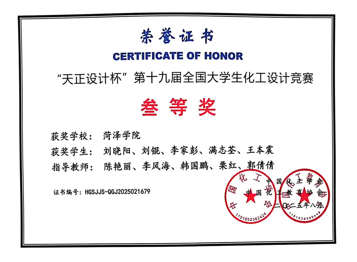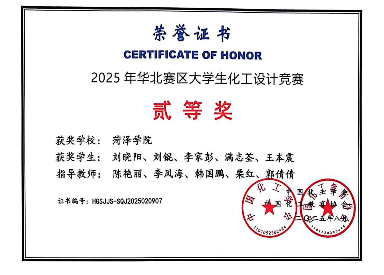 近日,由中国化工学会、中国化工教育协会主办,齐鲁工业大学(山东省科学院)与山东化学化工学会联合承办的第十九届全国大学生化工设计竞赛华北赛区决赛在齐鲁工业大学(山东省科学院)长清校区成功举办。我院《菏泽希望化工有限公司—年产1万吨二甲基亚砜清洁生产分厂项目》(指导教师:陈艳丽、李风海、韩国鹏、栗红、郭倩倩;参赛队员:刘晓阳、李家彭、满志荃、王本震、刘锟)在华北赛区决赛中获得二等奖,国家级三等奖一项的优异成绩。