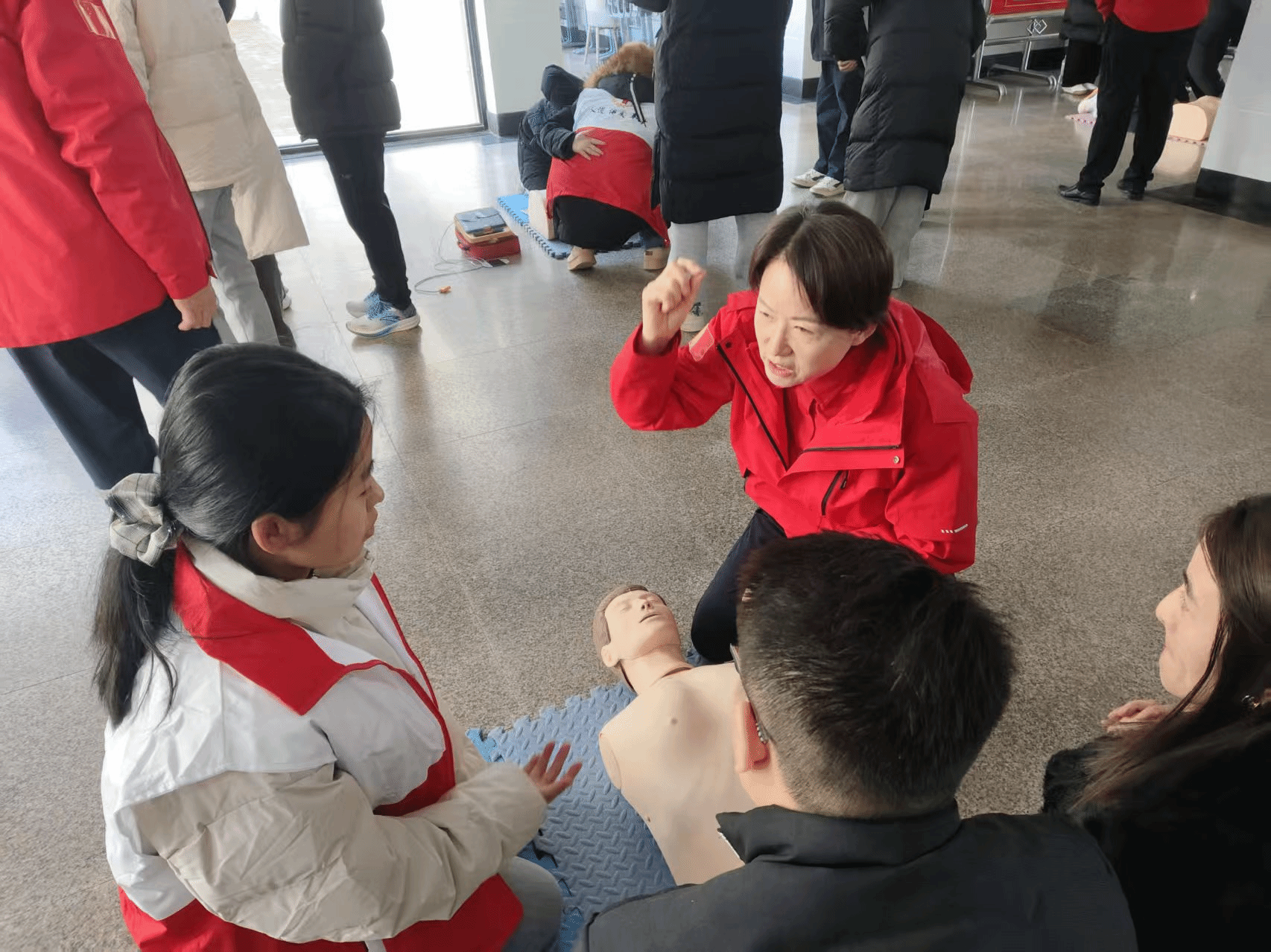 培训现场,红十字会的专业讲师结合校园生活与突发场景,从理论层面系统讲解了心肺复苏(CPR)、气道异物梗阻急救、创伤止血包扎等核心急救知识,通过典型案例剖析急救黄金时间的重要性,让参训师生清晰认识到掌握基础急救技能的必要性。中狮连牡丹服务队的志愿者则聚焦实操环节进行手把手教学,借助模拟人教具演示心肺复苏的标准流程——从判断意识、胸外按压的深度与频率,到规范实施人工呼吸;同时示范了三角巾包扎、止血带使用等创伤急救操作,逐一纠正师生在实操中的不规范动作,确保大家熟练掌握操作要领。培训最后,全体参训师生依次参与了心肺复苏、创伤包扎、气道异物梗阻急救等技能的考核,评委依据专业标准严格评分,全员通过考核,展现了扎实的学习成效。