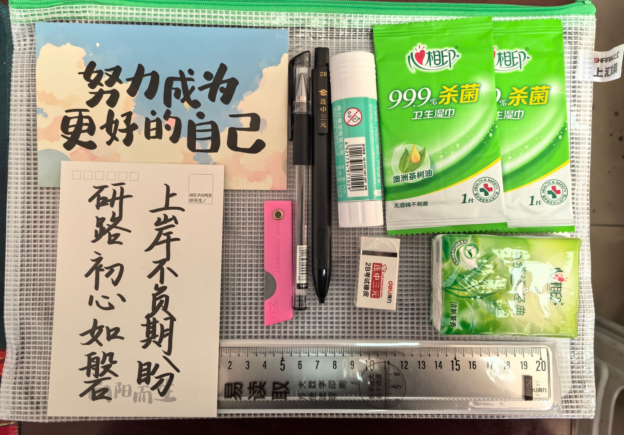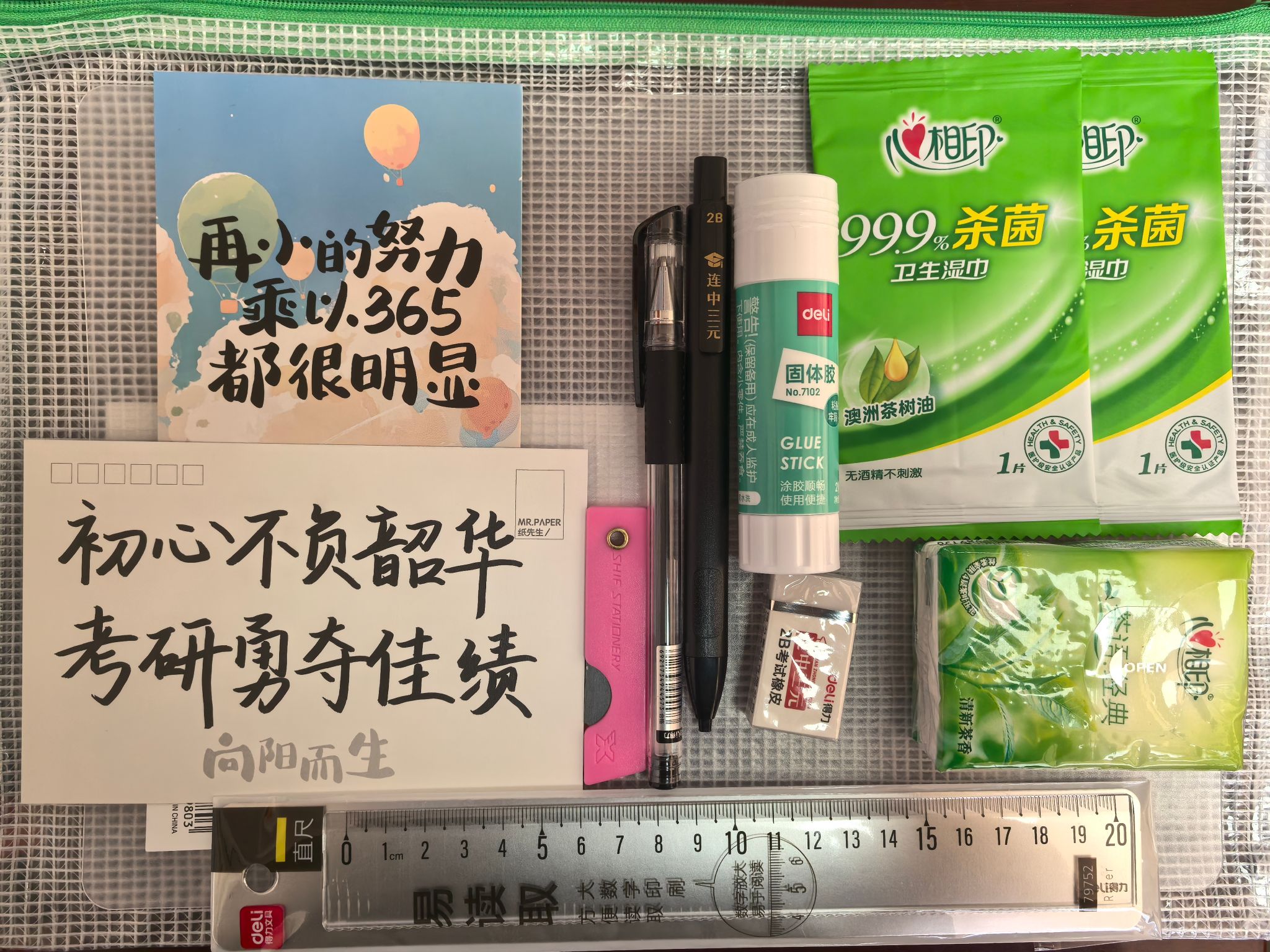 考试用品:2B铅笔、中性笔、尺子、橡皮、小刀、胶棒等,仔细核查考研礼包内文具。