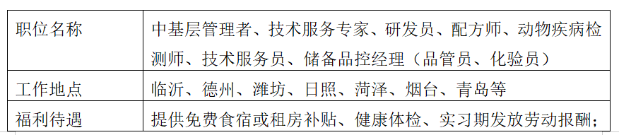 1.招聘要求:中基层管理者、技术服务专家;畜牧兽医、动物/植物营养、化学等相关专业,硕士及以上学历研发员、配方师、动物疾病检测师、技术服务员;畜牧兽医、动物/植物营养、动医、动科、水产养殖、化学、生物等相关专业,本科及以上学历。