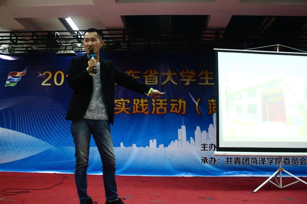 我系学生会副主席王鹏作为暑期调研队代表,上台为众人报告调研过程,展示调研成果。王鹏在讲解的过程中,通过结合ppt使“我系老师指导调研工作”“调研队成员为小学生讲课”“调研成员陪孩子们做游戏”等场景在观众面前一一展现。随后,王鹏在台上详细讲述了我系调研的整个过程,以及在调研中“锻炼自己、收获友谊”的心得,引得台下掌声连连。