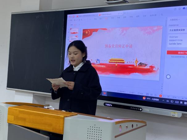 会议伊始,王庆美宣布了此次会议的重要性以及会议的流程。随后,杜汶洁、张永恒、孔凯、张慧丹、王慧杰、郭梓鑫、潘康慧、刘雪、张一朵、李晶、李郡等11名同志向党支部汇报自己在预备期内的表现,他们从思想、工作、学习和生活等方面向党支部进行详细的汇报,指出了自己的缺点,表明了以后努力的方向,并庄严的向党组织提出转正申请。紧接着,与会党员对杜汶洁等11名预备党员是否按期转正进行了充分的讨论,提出是否同意他们按期转正为正式党员的意见。王庆美代表党支部向大会介绍了11名预备党员在预备期的表现和支部考察意见。经过充分讨论和无记名投票意见,大会同意杜汶洁等11名同志按期转正为正式党员。会议最后,王庆美代表党组织向11名同志按期转正表示祝贺,希望他们时刻牢记自己入党时的郑重承诺,并将这种承诺带入今后的工作、学习和生活中去,立足实际工作,严格履行党员的权利和义务,为广大师生多做贡献,切实起到模范带头作用,全心全意为学校服务。
