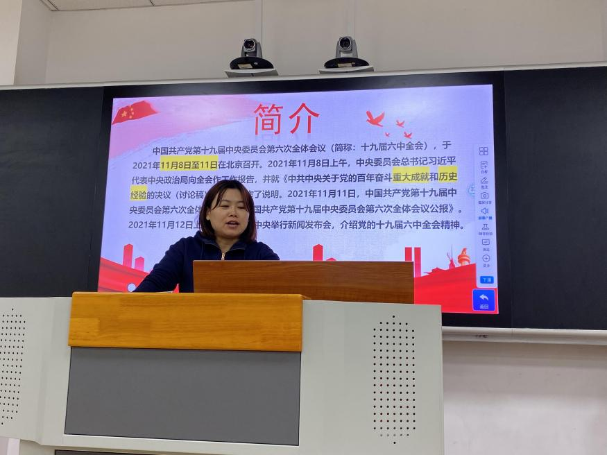 会上,王庆美老师带领着同学们围绕习近平总书记在全会上的重要讲话,深刻阐述了为什么要总结党百年奋斗的重大成就和历史经验、如何深刻认识党的百年奋斗历程等重大问题进行了深刻的学习。高靖老师带领同学们深入学习中国共产党第十九届中央委员会第六次全体会议公报,同时也要求学生党员进一步增强“四个意识”,迅速把思想和行动统一到全会精神上来。