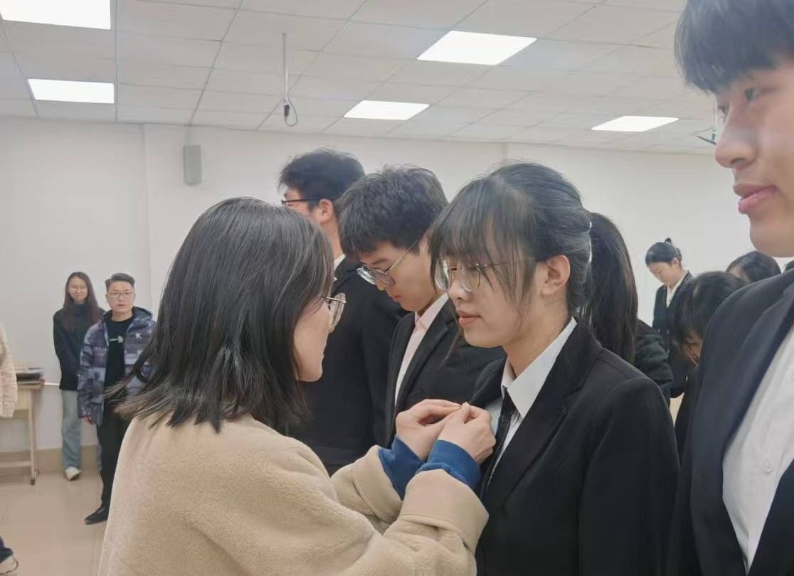 随后,高靖和付亚男为新团员们佩戴团徽。
