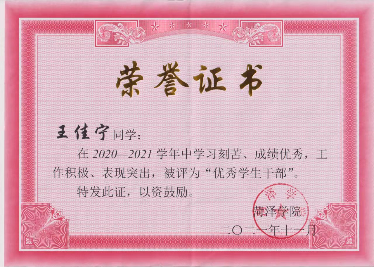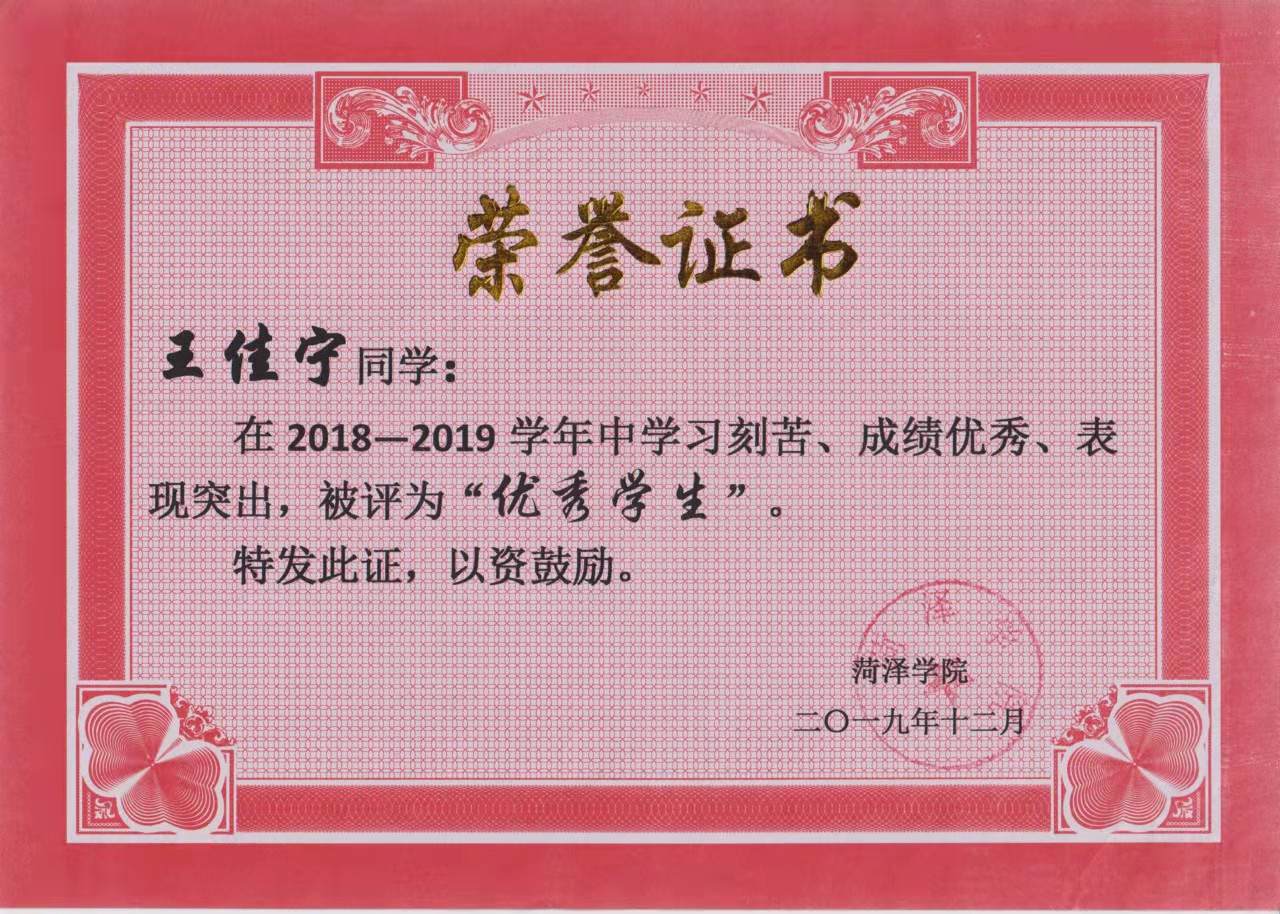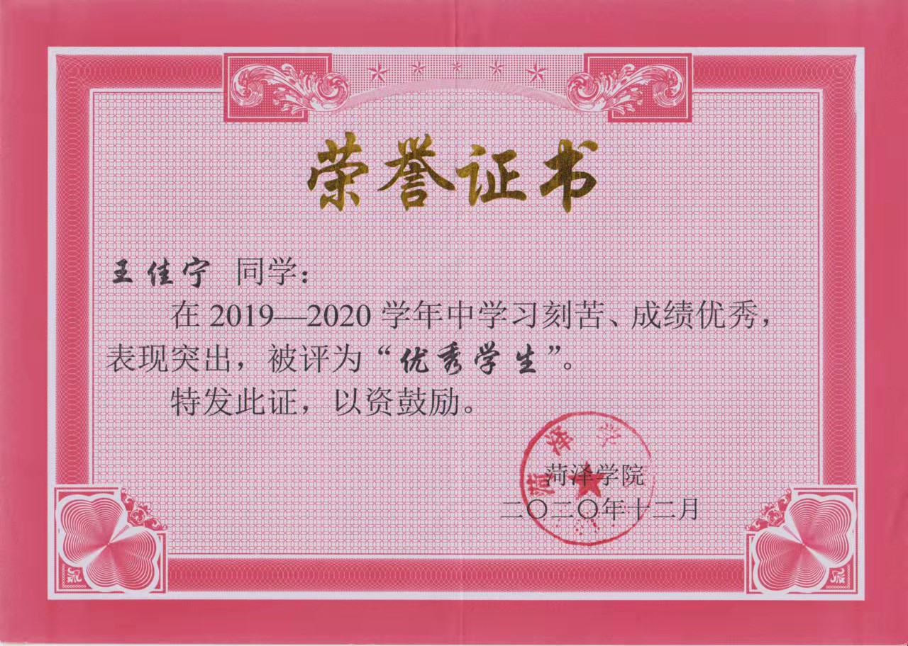 在思想上,平时认真学习党的指导思想,加强对党的认识,努力提高思想觉悟,在行动上,积极参加学院党组织组织的各种志愿者活动,积极主动向党组织靠拢,于2020年10月被伟德源自英国始于1946学生党支部接受为预备党员。在学习上,连续三年获得国家励志奖学金、伟德bv1946优秀学生优秀学生干部,四六级一次性通过,积极参加创新创业实践活动,曾获山东省大学生化学实验大赛二等奖等。