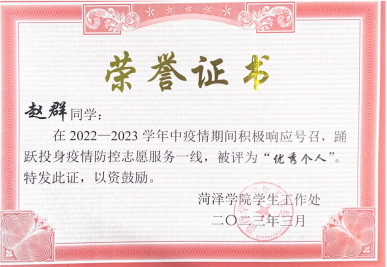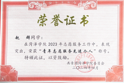 自进入大学以来,我长期投身于公益志愿服务,累计参加30余场志愿服务活动,荣获了“优秀志愿者”、“疫情防控优秀个人”、“青年志愿服务先进个人”等志愿服务类荣誉称号。