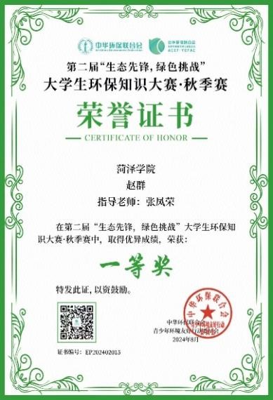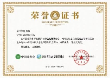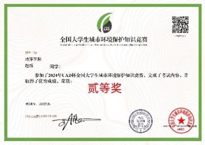我始终保持着高度的热情和专注,勤奋刻苦、态度端正,坚持以学业为重,不断提高自身专业素养。我不仅专业成绩优异,还积极参加各类学科竞赛,在第二届“生态先锋,绿色挑战”大学生环保知识大赛秋季赛等竞赛中取得优异成绩。