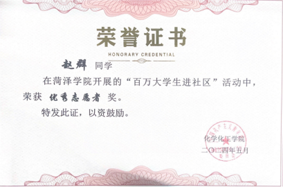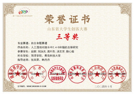在科研项目中,我与团队成员携手共进,申请的大学生创新训练项目《人工湿地对废水中2,4-D和镉的去除研究》获校级立项,作为核心成员参与的山东省大学生科技创新竞赛《杨木生物质基复合物的制备及对重金属吸附性能研究》进入省赛。我相信坚定的信念和不懈的努力,是在学术的道路上取得成功的关键因素。