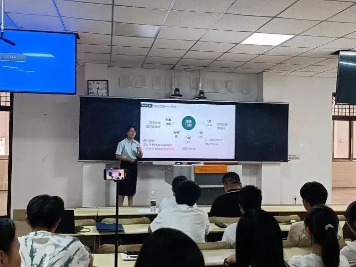 随后由陈琳进行试讲,陈琳在课堂上运用PPT、音频以及师生提问等多种形式的教学方法,使整个课堂的氛围非常活跃。接着陈琳开始分享自己对师范生就业技能大赛的认识,并从备赛初期、备赛中期以及比赛过程分享自己的心路历程。