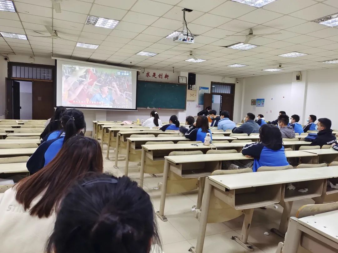 晚上七点,同学们有序到达教室,在负责人的引导下,同学们戴好口罩,有序分散坐开。放映开始,同学们聚精会神、认真专注地观看着屏幕。