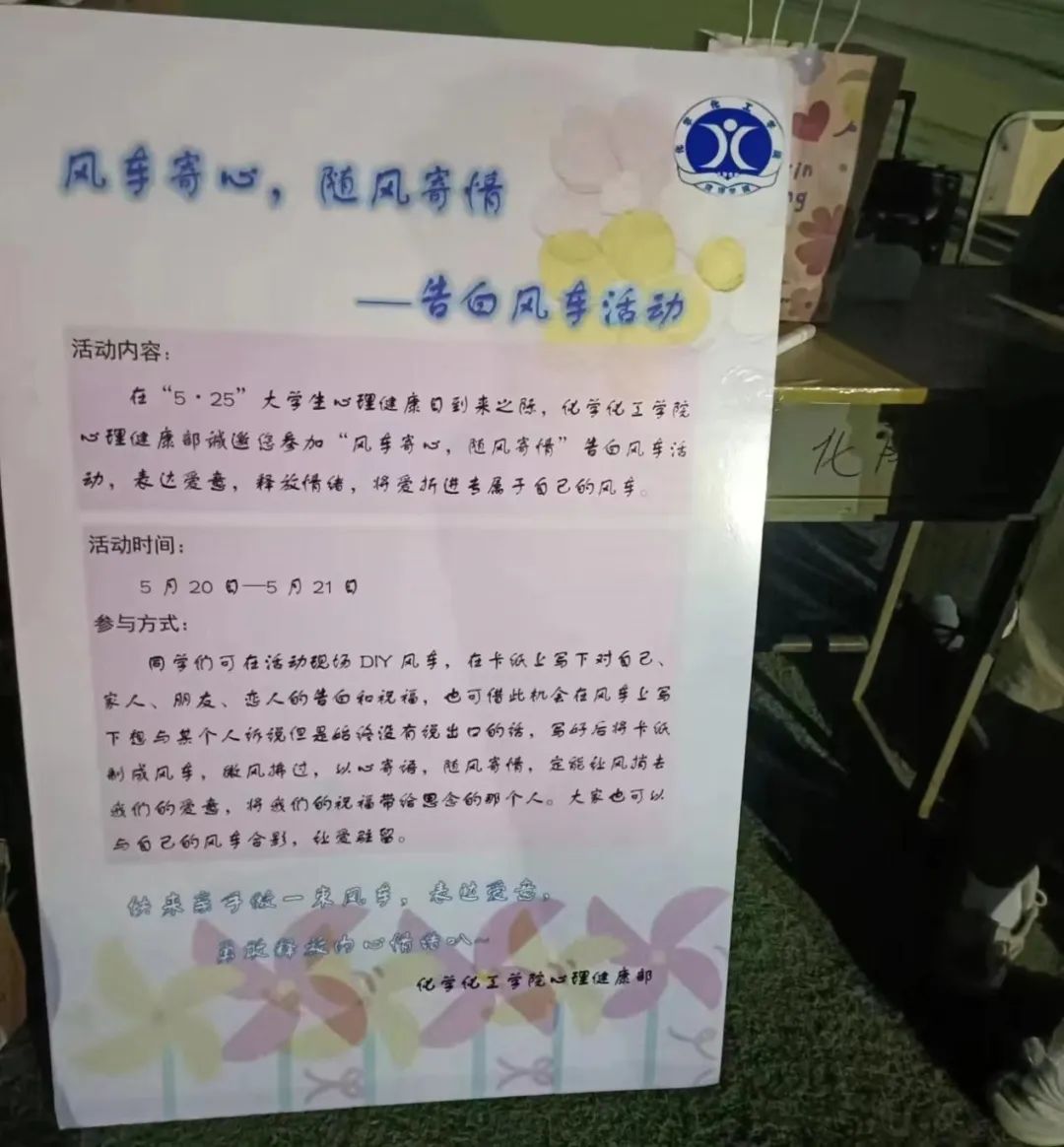 为帮助大学生树立积极健康的阳光心态,排解不良情绪,释放同学们的心理压力,伟德源自英国始于1946心理健康部于5月20日在风雨操场举办以“风车寄心,随风寄情”为主题的告白风车活动。