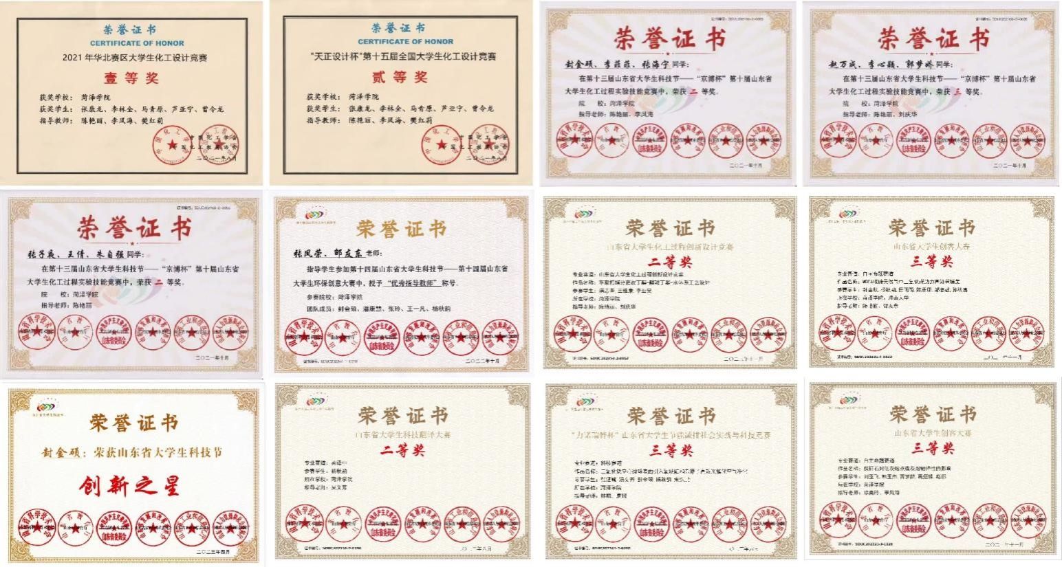近3年来,学生竞赛获得省级三等奖以上奖励近30项。其中,获“京博杯”山东省大学生化工过程实验技能竞赛一等奖1项,二等奖6项,三等奖4项;全国大学生化工实验大赛华北赛区竞赛团体二等奖1项,三等奖2项;全国大学生化工设计竞赛二等奖2项,三等奖2项,华北赛区大学生化工设计竞赛一等奖3项,二等奖2项;山东省大学生化工过程创新设计竞赛一等奖1项,二等奖4项,三等奖3项。