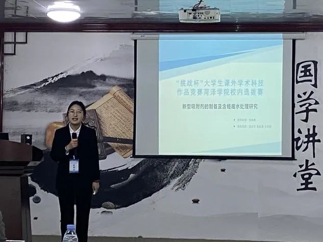 汤文芳、张涵毓、封金硕三位同学分别以“新型吸附剂的制备及含铬废水处理研究”、“TiO₂空心微球表面引入氧缺陷和杂原子高效光催化空气净化”、“MDEA吸收法脱除天然气中二氧化碳仿真模拟”为题,从研究背景、研究目的、研究方法、创新点、实用性以及项目发展前景等方面出发,详细介绍了其研究项目,赢得了现场评委老师们的一致肯定。