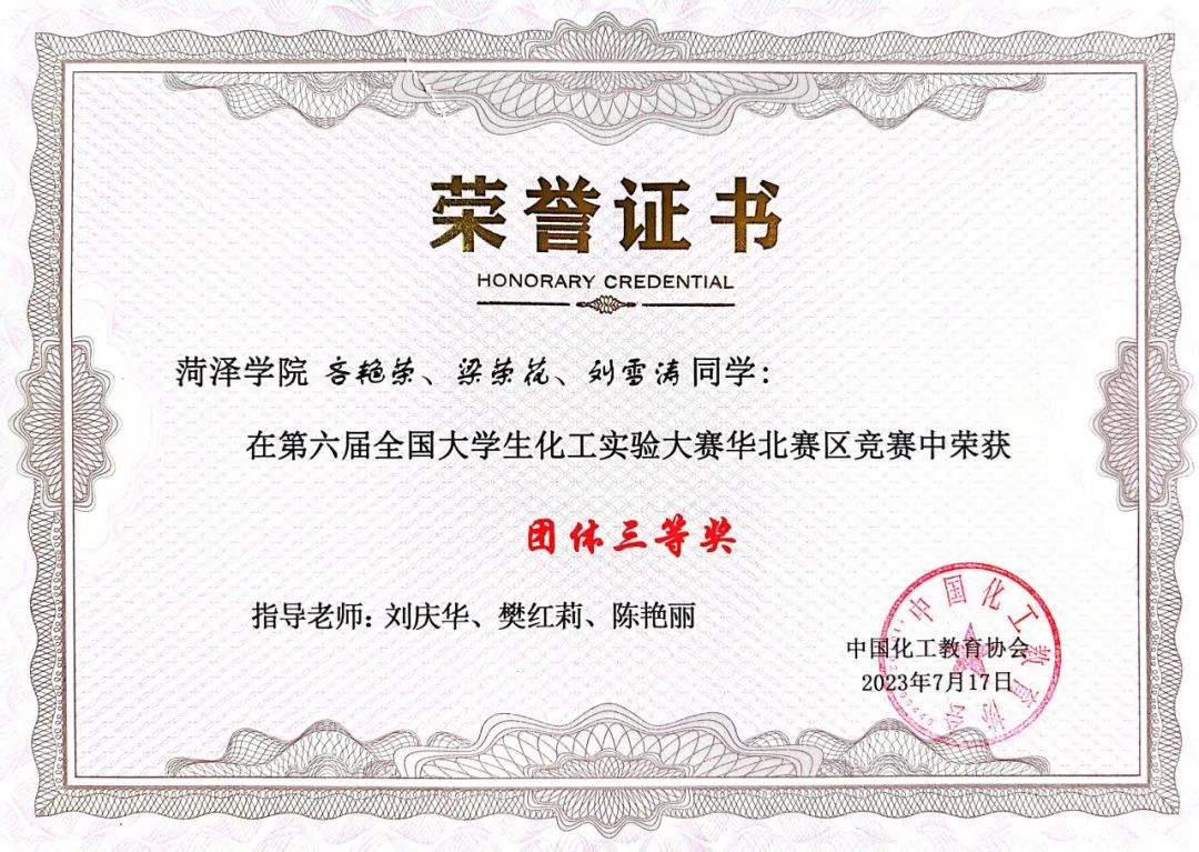 近日,由中国化工教育协会举办的第六届全国大学生化工实验大赛华北赛区竞赛在烟台落下帷幕,在刘庆华、樊红莉、陈艳丽三位老师指导下,吝艳荣、梁荣花、刘雪涛三位同学获得了团体三等奖的好成绩。