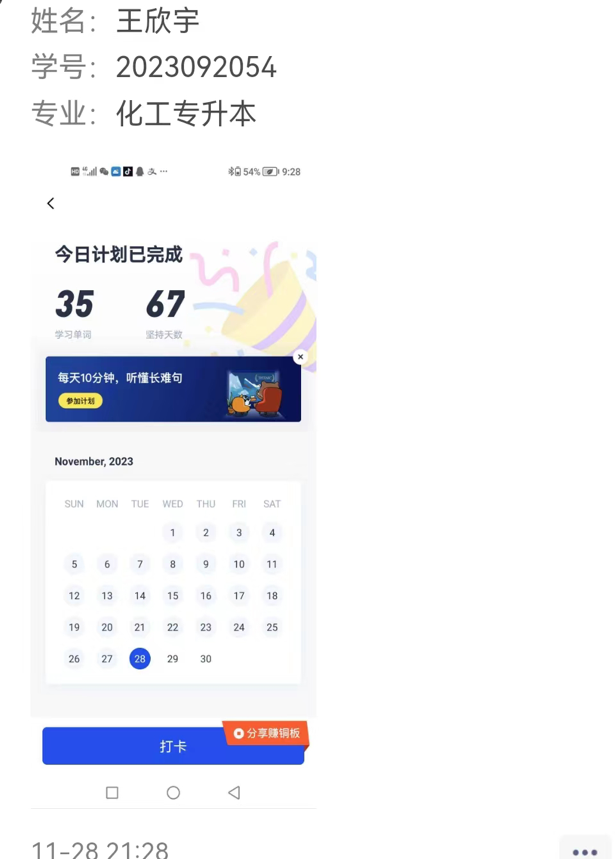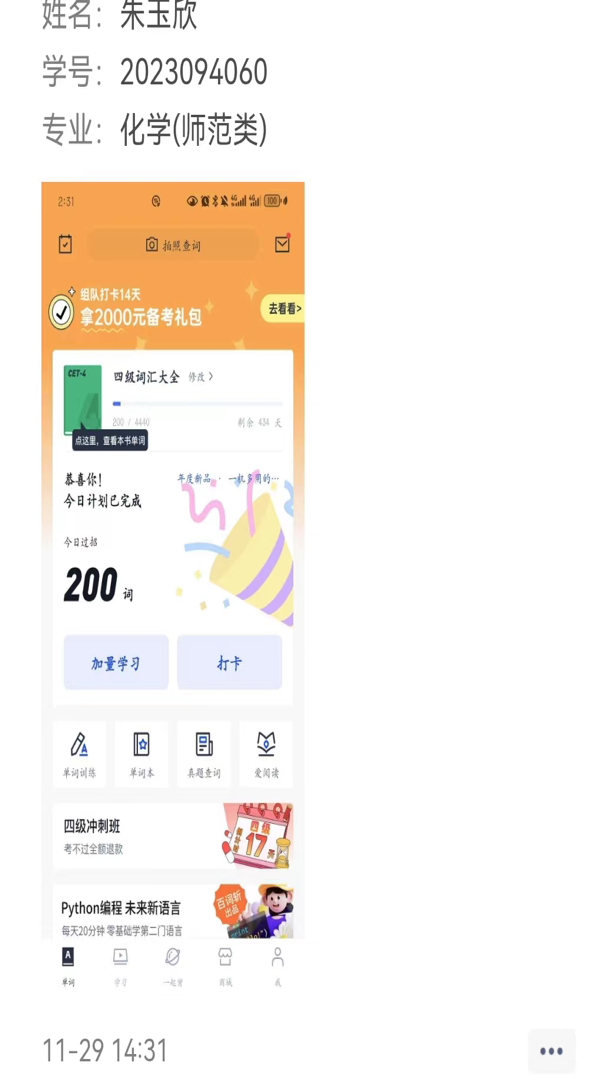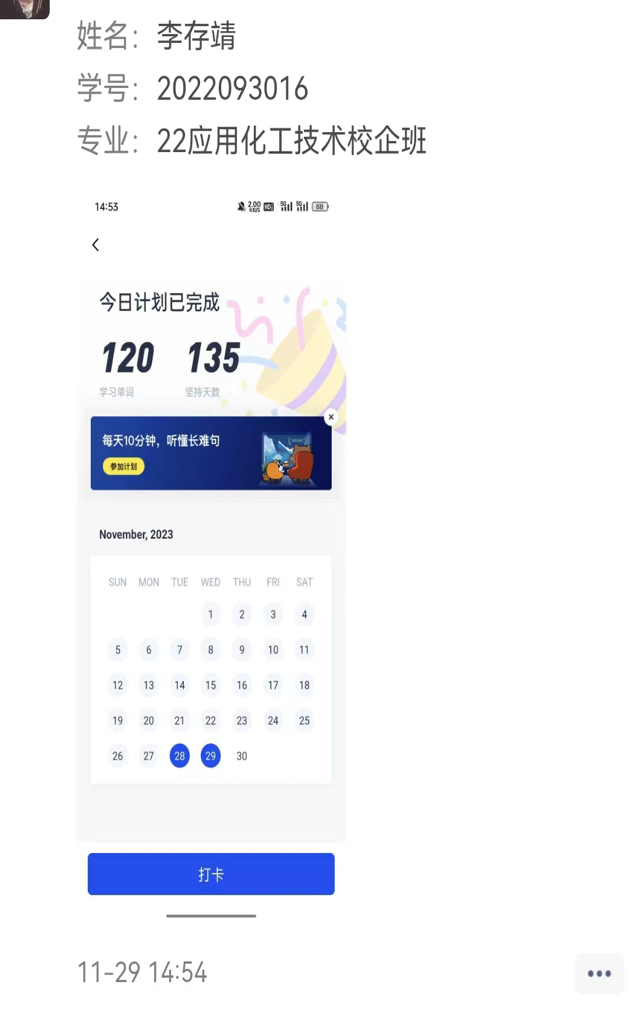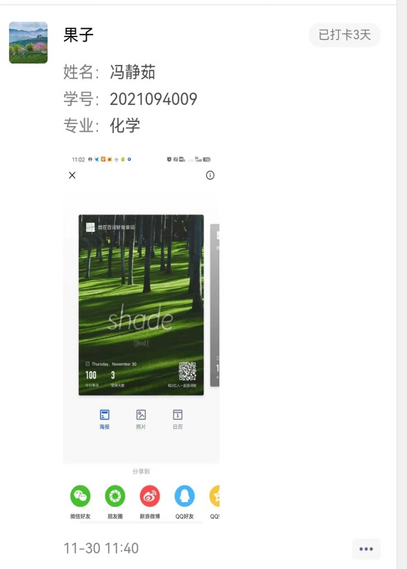 我院学子积极参加报名,信心满满。活动期间,打卡群同学们互相监督,互相鼓励,共同进步。活动结束,有关人员整理线上打卡资料,根据学生每日单词学习量以及打卡内容质量为标准,评出最终奖项。